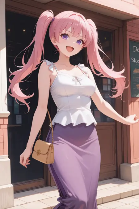 일반 외모의 세라를 원하면 "defser, 핑크 헤어, 트윈테일, 보라색 눈, 긴 머리, 보라색 스카프, 흰색 드레스, 어깨 없는 드레스, 긴 드레스, 청록색 벨트, 흰색 장갑, 팔꿈치 장갑"을 추가하세요.