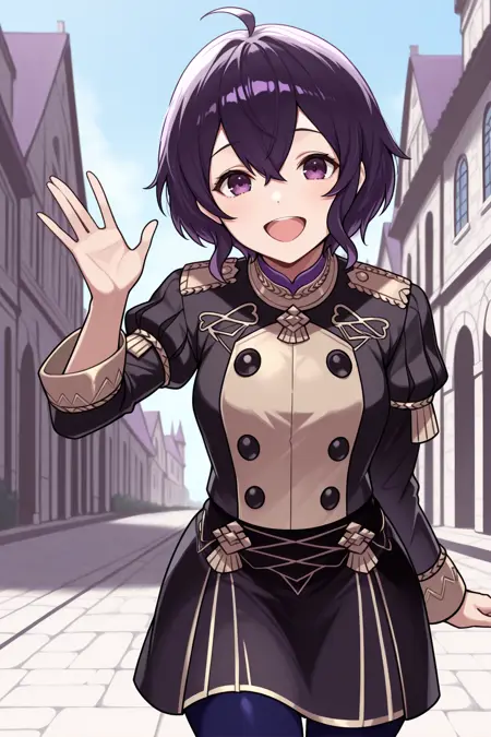 Add "defmg, ahoge, dark purple hair, short hair, hair between eyes, purple eyes, black dress, short dress, hood down, two-tone dress, long sleeves, black sleeves, black gloves, white armor, purple belt, white thighhighs, brown boots, knee boots" for her Heroes redesign.