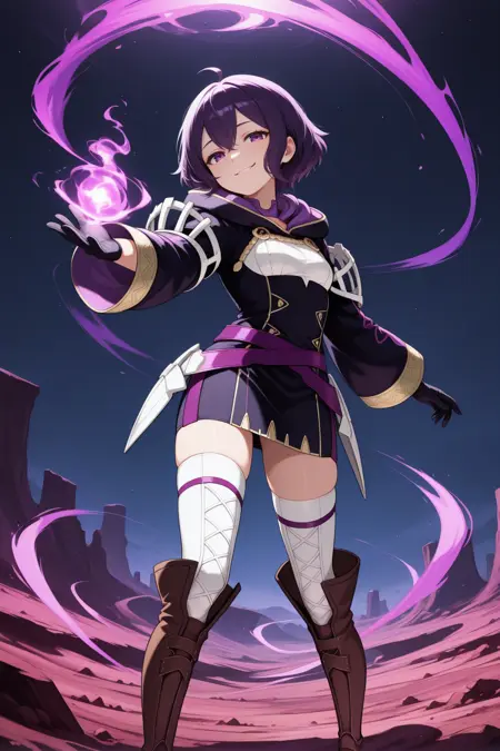 为她的《觉醒》造型添加:“orgmg, ahoge, 深紫色头发, 短发, 发丝垂于眼睛间, 紫色眼睛, 黑色外套, 黑色长袍, 披风下垂, 米色衬衫, 棕色束腰, 黑色手套, 宽松长裤, 米色长裤, 棕色靴子”。