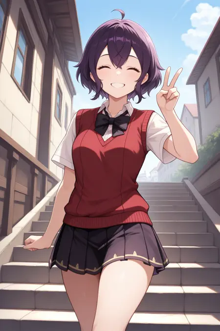 为她的《英雄》重制版造型添加:“defmg, ahoge, 深紫色头发, 短发, 发丝垂于眼睛间, 紫色眼睛, 黑色连衣裙, 短款连衣裙, 披风下垂, 双色连衣裙, 长袖, 黑色袖子, 黑色手套, 白色盔甲, 紫色腰带, 白色过膝袜, 棕色靴子, 膝盖靴”。