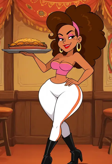 Zafiro, 1girl, solo, Voluminous curly dark brown hair, mole on cheek, light skin, pink headband, full red lips, large gold hoop earrings, small waist, wide hips, pink top, white tight pants, high black heeled boots