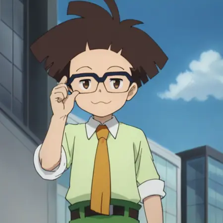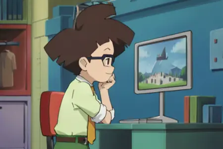 提示:男性,棕色头发,棕色眼睛,戴眼镜,有领衬衫,袖子卷起,领带,腰带,短裤,袜子,鞋子,室内(卧室/电脑桌/电脑/红色椅子/书籍),室内(教室/课桌/课椅/黑板/窗户),室外(城市/天空/云/建筑),室外(河流/围栏/箱子/桶),室外(森林/蓝天/树)