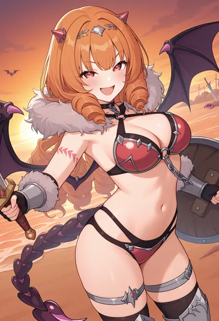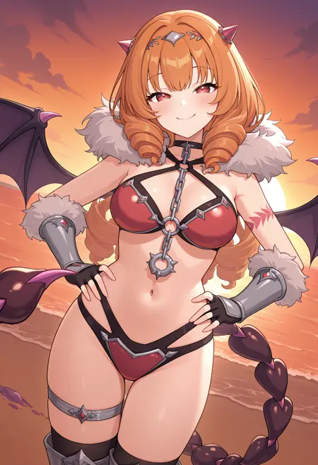 王冠, 比基尼盔甲, 红色比基尼, 黑色项圈, 交叉式挂颈, O型环上衣, 链条, 毛皮镶边, 手臂纹身, 护臂, 黑色手套, 无指手套, 大腿绑带, 黑色长筒袜, 尾巴环绕腰部, 铠甲靴子,
