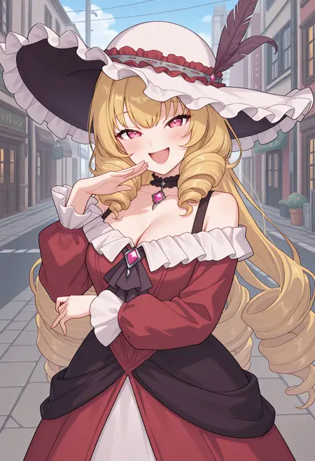 帽子羽毛, 荷叶边帽子, 白色头饰, 帽子, 荷叶边领子, 黑色项圈, 领结, 吊坠项圈, 宝石, 暴露胸部, 白色荷叶边, 层叠连衣裙, 红色连衣裙, 白色连衣裙,