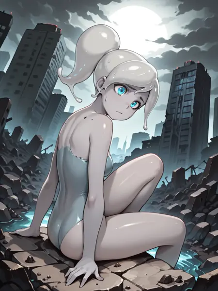 TFSPuddin, grey skin, blue eyes, ponytail, monster girl