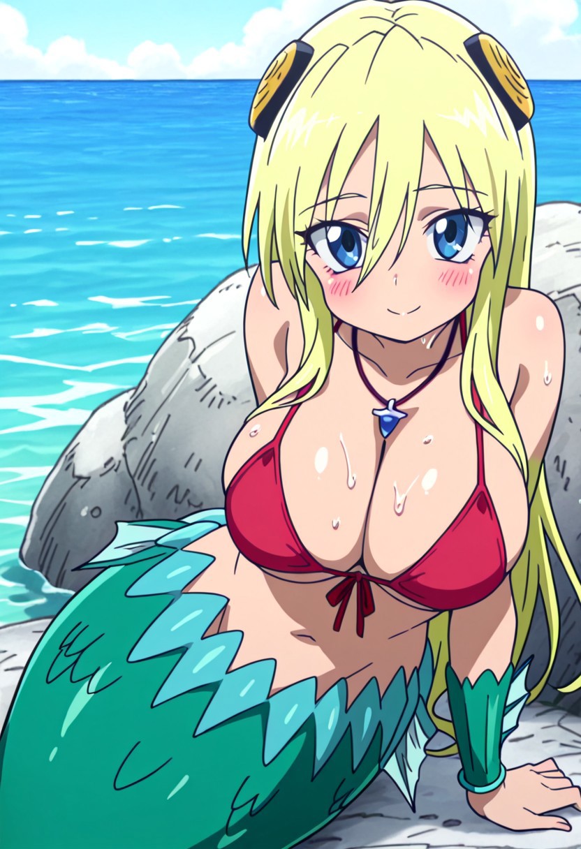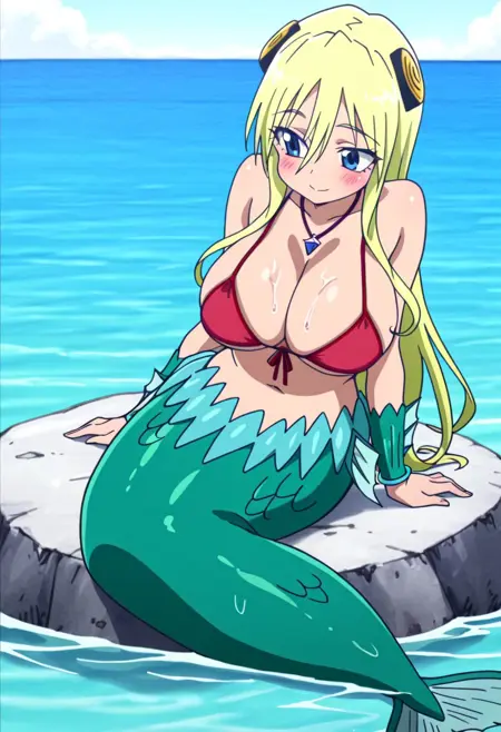 Appearance: blonde hair, blue eyes, long hair, hair ornament, shell, hair between eyes, huge breasts, bracelets, monster girl, mermaid, mermaid tail, green tail, fins