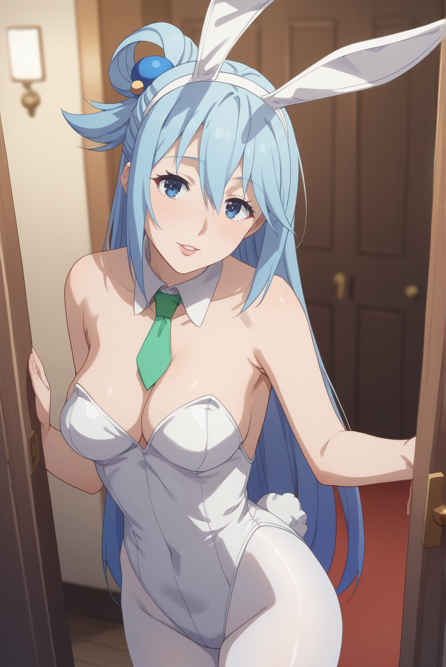 outfit_4, 플레이보이 번니, 토끼 꼬리, 인조 동물 귀, 헤드밴드, 어깨 노출, 분리형 칼라, 녹색 넥타이, 짧은 넥타이, 흰색 레오파드, 스트랩리스 레오파드, 하이레그 레오파드, 팔꿈치 장갑, 흰색 장갑, 손가락 없는 장갑, 흰색 스타킹,