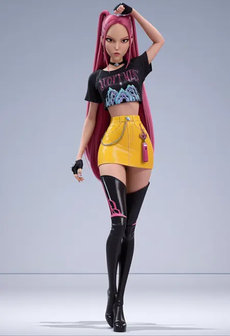 m1rilf, 1girl, 棕色眼睛, 超长发, 双马尾, 粉色头发, 耳环, 项圈, 短上衣, 裙子, 无指手套