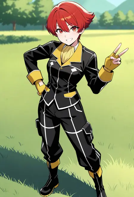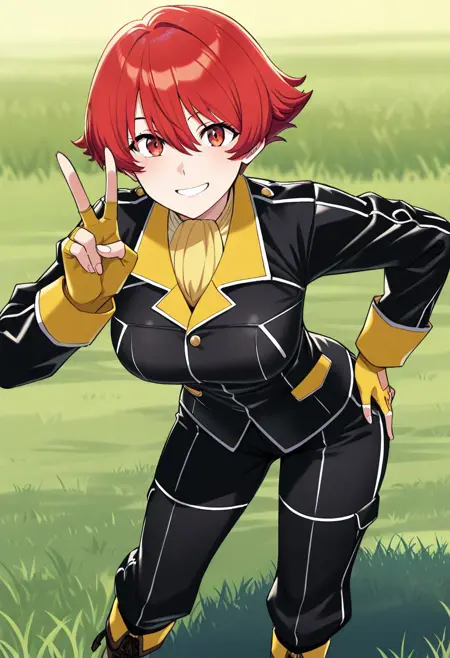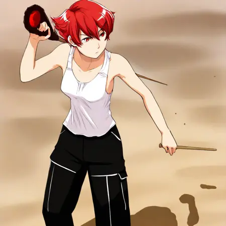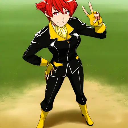 红发的假小子,喜欢打架。最初是反派角色,隶属于黑黄蜂中队(因此她的制服配色如此),在上司抛弃她并试图杀害她之后,她加入了英雄阵营。与Mana不同,她实际上拥有一张彩色图片(以及专属的人物介绍页,是整部漫画中唯一拥有此待遇的角色),因此色彩并非推测。由于她来自与我第一个LoRA相同的系列,我将用她来庆祝我制作LoRA一周年。