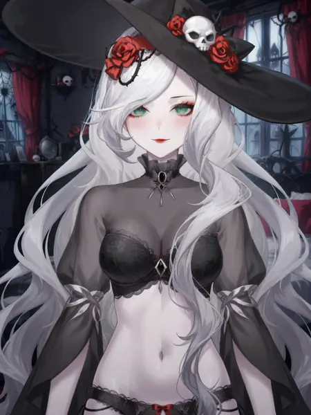 通用:1girl,单人,超长发,灰发,白发,发饰,花朵,发上花,玫瑰,红玫瑰,妆容,红唇,胸部,中等胸部,白皙皮肤