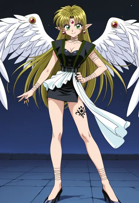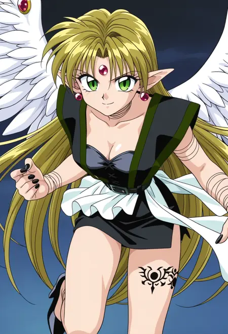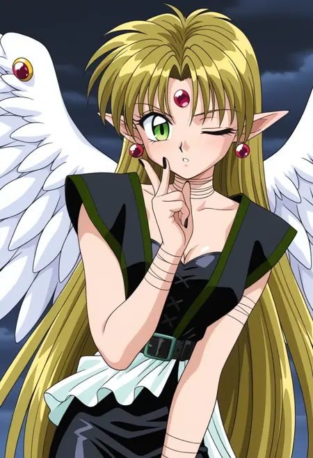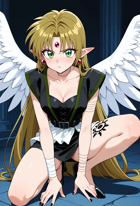 finn_fallenangel, blonde hair, very long hair, pointy ears, forehead jewel, green eyes, breasts,