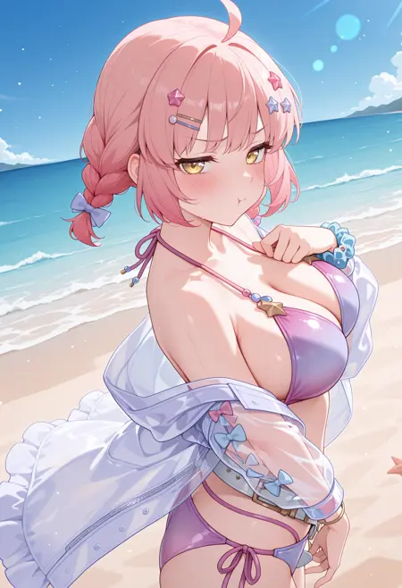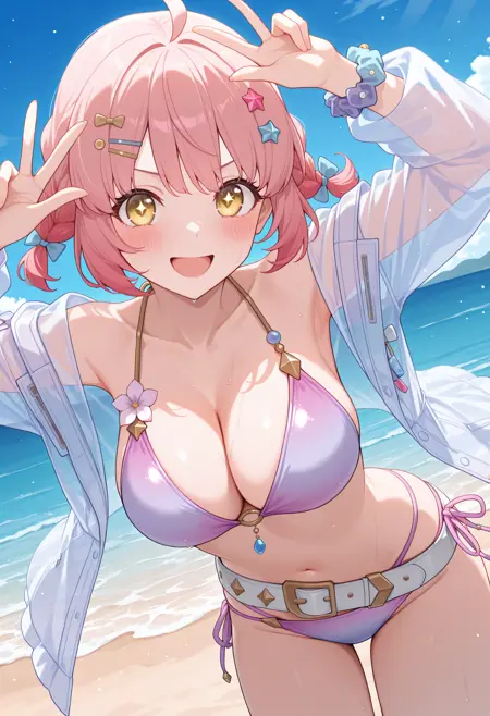- pchiewin, 헤어 보, 별 모양 머리 장식, 헤어 클립, 더블 브레이드, 보석, 연보라 비키니, 그라데이션 비키니, O 링 상의, 다중 끈 비키니 상의, 가슴 선, 흰 벨트, 느슨한 벨트, 꽃 장식, 사이드 타이 비키니 하의, 비즈 스 crunchie, 투명 재킷, 수영복 커버업, 열린 옷,