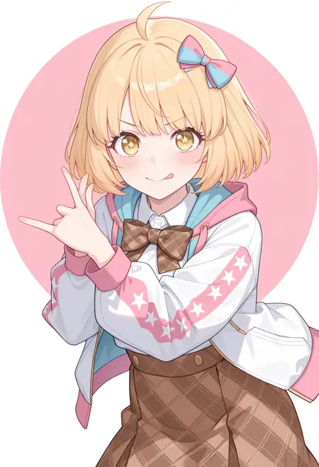 헤어 보, 투톤 보, 흰 재킷, 투톤 재킷, 양면 재킷, 분홍 줄무늬, 별 무늬, 열린 재킷, 체크 넥타이, 흰 셔츠, 체크 치마, 갈색 치마,