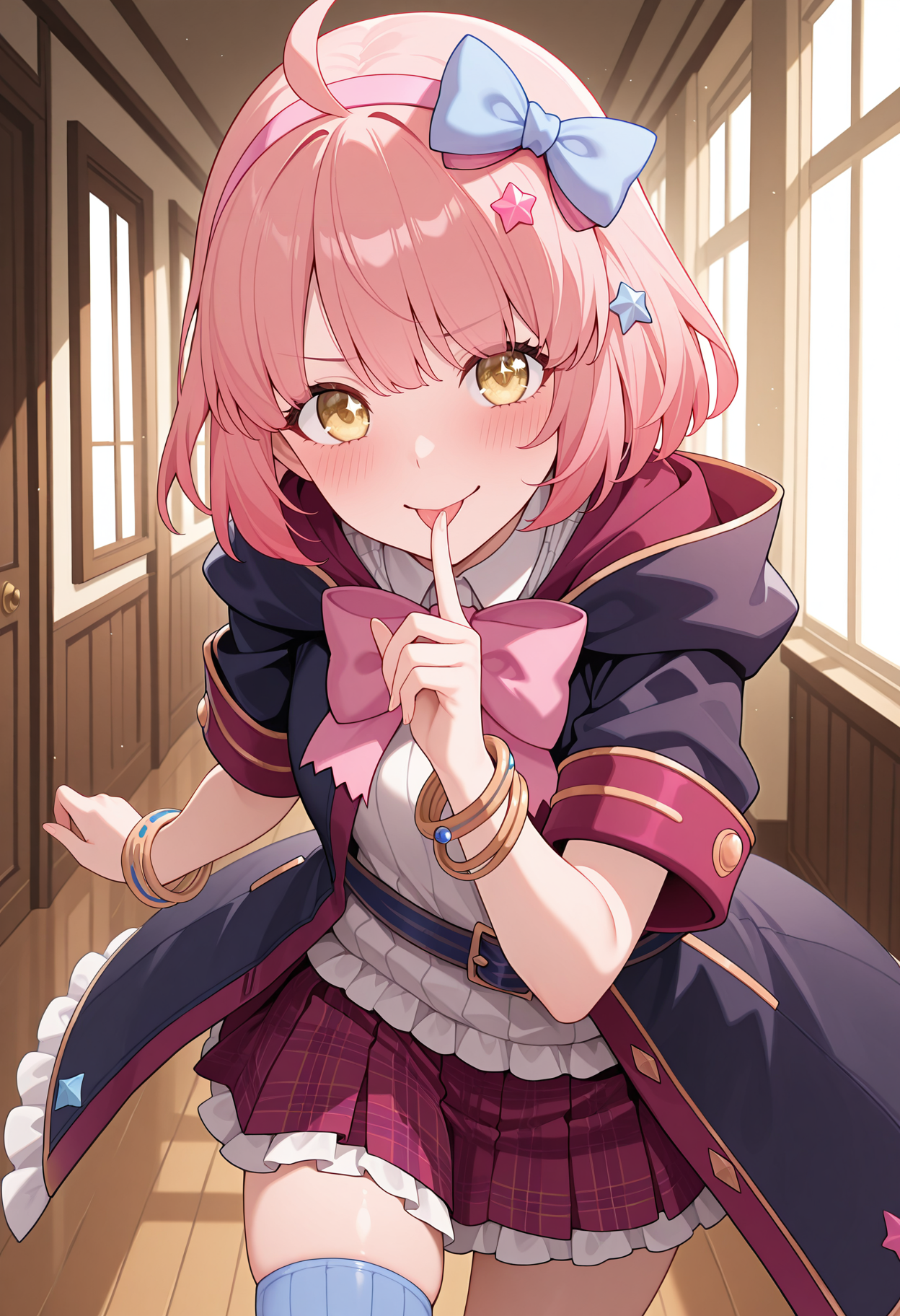 pchiedef, st. 테레사 여자 학교 유니폼, 별 모양 머리 장식, 분홍 헤어 밴드, 헤어 보, 파란 보, 검은 코트, 짧은 소매, 팔찌, 분홍 넥타이, 흰 셔츠, 리브드 셔츠, 벨트, 빨간 치마, 주름 치마, 체크 치마, 프릴, 단일 허벅지 양말, 파란 허벅지 양말,