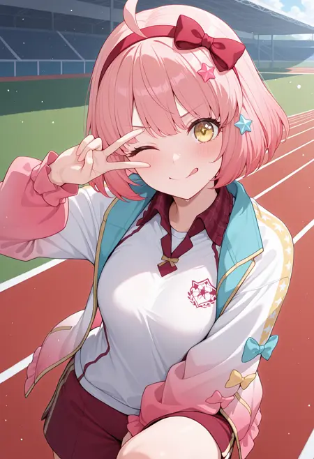 - pchiefes, 밥 머리, 별 모양 머리 장식, 빨간 헤어 밴드, 헤어 보, 다색 재킷, 그라데이션 재킷, 재킷 보, 체육복, 체크 칼라, 보, 흰 셔츠, 빨간 반바지, 프릴,