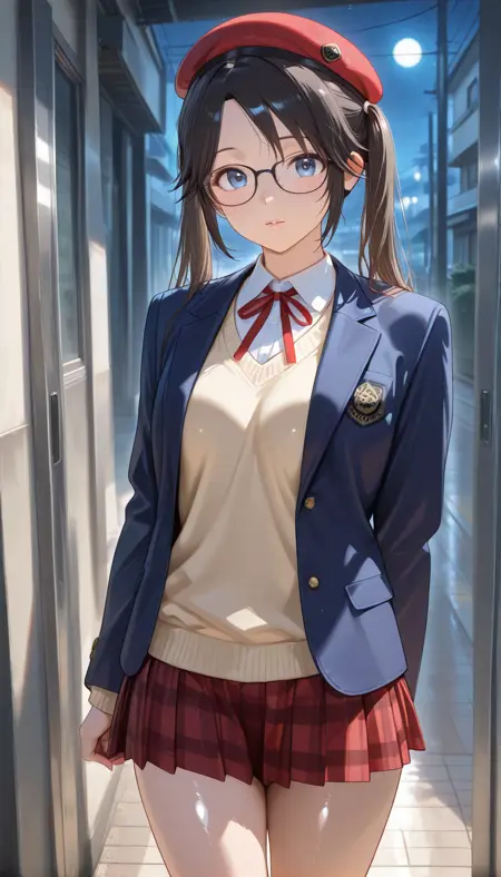 셔츠, 치마, 긴 소매, 모자, 리본, 재킷, 학교 복장, 흰색 셔츠, 허벅지, 주름 치마, 오픈 옷, 칼라 셔츠, 미니 치마, 오픈 재킷, 빨강 리본, 스웨터, 빨강 리본, 체크무늬, 목 리본, 빨강 치마, 베레모, 체크 무늬 치마, 파란 재킷, 블레이저, 빨강 머리 장식, 노랑 스웨터
