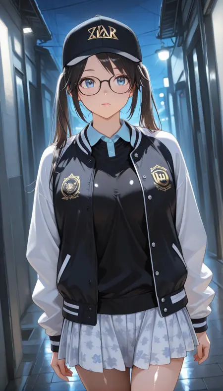 셔츠, 치마, 긴 소매, 모자, 재킷, 주름 치마, 미니 치마, 하운즈투스, 검은 셔츠, 검은 재킷, 검은 머리 장식, 흰 치마, 야구 모자, 플로럴 프린트, 프린트 치마, 흰 소매, 칼라 셔츠, 미니 치마, 레터맨 재킷,