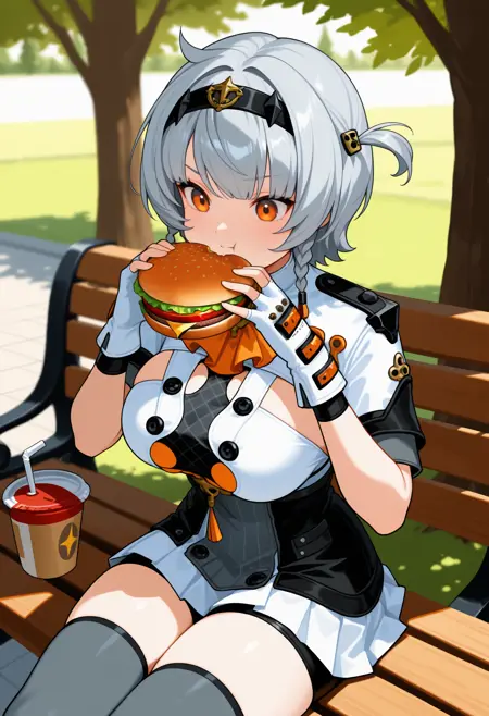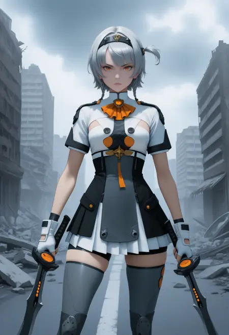 士兵0: 短发, 灰发, 一侧高高束起, 双辫子, 黑色发带, 橙色眼睛, 短裙, 白色裙子, 百褶裙, 衣服剪裁, 橙色领巾, 按扣, 短袖, 白色手套, 无指手套, 黑色短裤, 紧身骑行裤, 灰色过膝袜, 腿部护甲