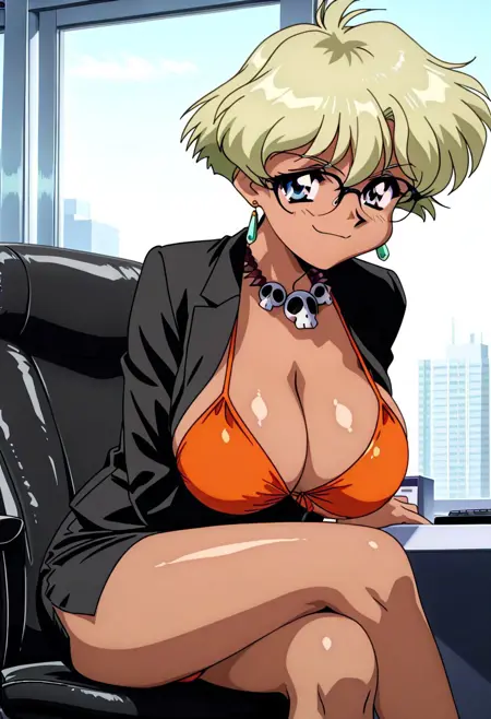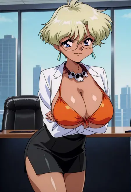 Mii, 1girl, solo, retro artstyle, 1990s \(style\), blue eyes, blonde hair, short hair, huge breasts, curvy, wide hips, dark-skinned female, dark skin, shiny skin, smoothy skin, jewelry, necklace, earrings, skull necklace, greenish navel, shoes, green ballet slippers, skirt, orange-yellow flower petals skirt, o-ring strapless top, cleavage, midriff, ballet shoes, miniskirt, bikini top, swimsuit,