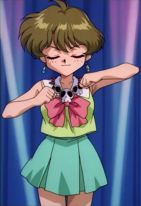 Natsumi, 1girl, solo, retro artstyle, 1990s \(style\), purple eyes, brown hair, ((fair skin:1.3)), short hair, breast, shiny skin, smoothy skin, jewelry, earrings, necklace, sleeveless, sleeveless shirt, pink bow, bowtie, skull necklace, green skirt, school uniform, miniskirt, pleated skirt, mary janes shoes, white socks,