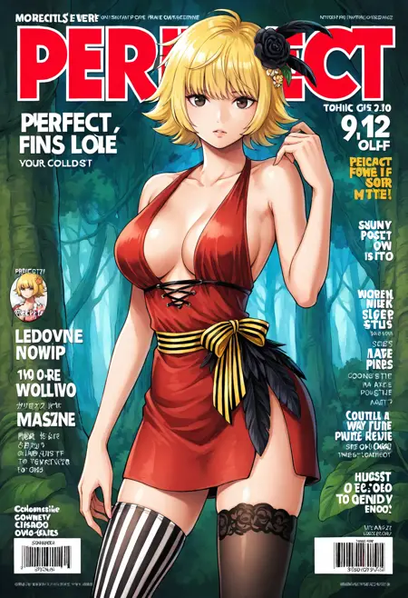 가슴, 드레스, 허벅지 스타킹, 빨간 드레스, 줄무늬, 머리 장식, 쇄골, 큰 가슴, 줄무늬 허벅지 스타킹, 수직 줄무늬 허벅지 스타킹, 수직 줄무늬, 깃털 머리 장식, 머리 꽃, 검은 허벅지 스타킹, 노란 리본, 리본, 줄무늬 드레스, 짧은 드레스, 비대칭 다리 착용, 검은 눈, 검은 깃털, 옆 슬릿