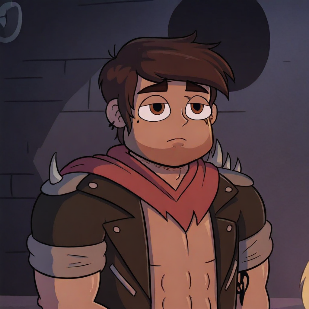 Promps: AdultMarco, 1boy, solo, male only, male focus, tan skin, brown hair, short hair, brown eyes, mole under eye, scar, facial hair, stubble, muscular, leather jacket, scarf, pants, open clothes,