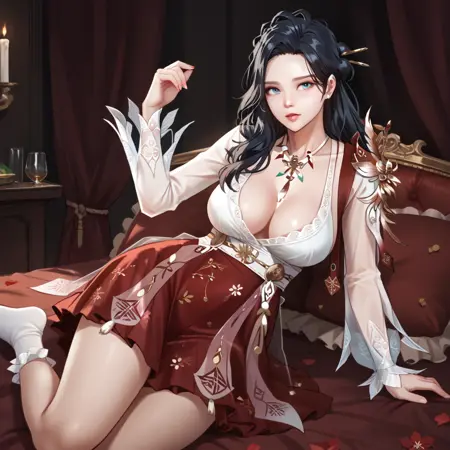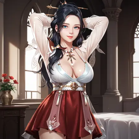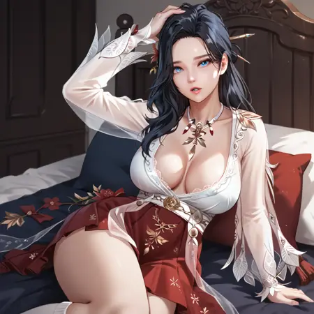 Vindictus_Danah, 1girl, solo, blue eyes, large breasts, black hair, long hair, hair ornament, dress, long sleeves, cleavage, see-through, red skirt, jewelry, necklace, white socks