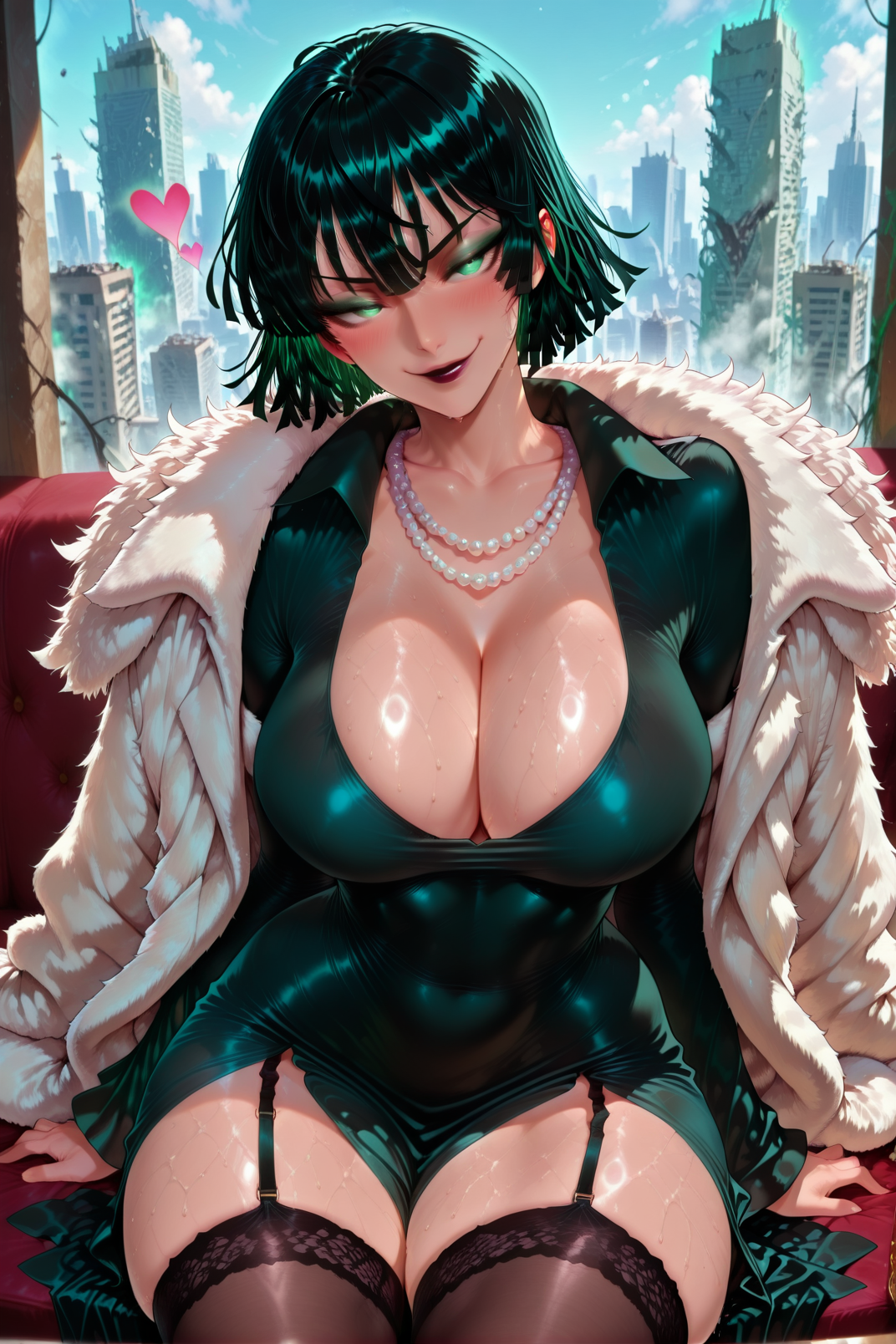 ilfubuki, fubuki \(一拳超人\), 1girl, breasts, necklace, penis, sex, hetero, 1boy, nipples, jewelry, underwear, thighhighs, large breasts, vaginal, anus, green eyes, short hair, ass, panties, pussy, uncensored, black panties, ass grab, garter belt, green hair, ahegao, thong aside, sweat, solo focus, clothing aside, tongue, panties aside, thong, open mouth, tongue out, sex from behind, pussy juice, on bed, dark-skinned male<lora:illustrious Fubuki 02 768x1152:1>