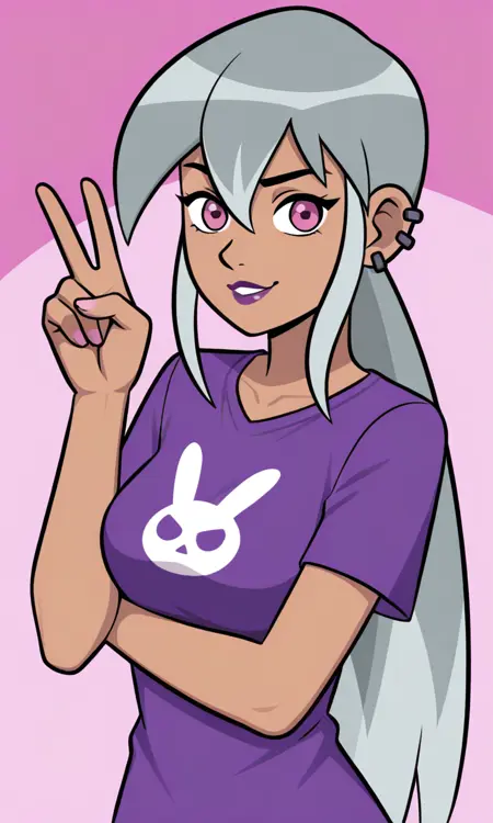 charmcaster, 1girl, solo, pink eyes, long hair, ponytail, grey hair, hair between eyes, purple lips, ear piercing,dark skinned,medium breast