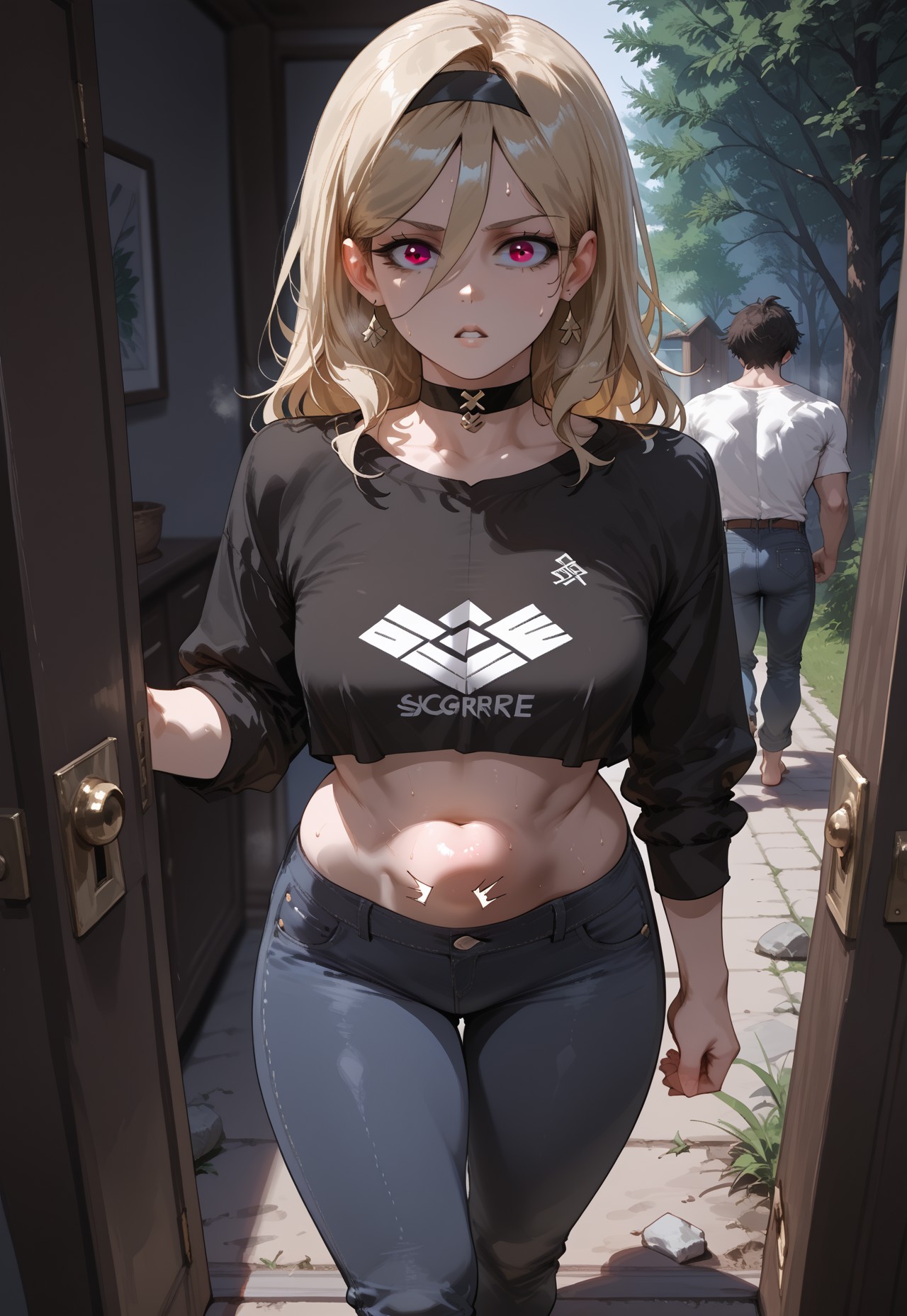 Almost Getting Caught, Pov doorway, cowboy shot, after sex, 1girl, hands on door, looking at viewer, 1boy, male in background