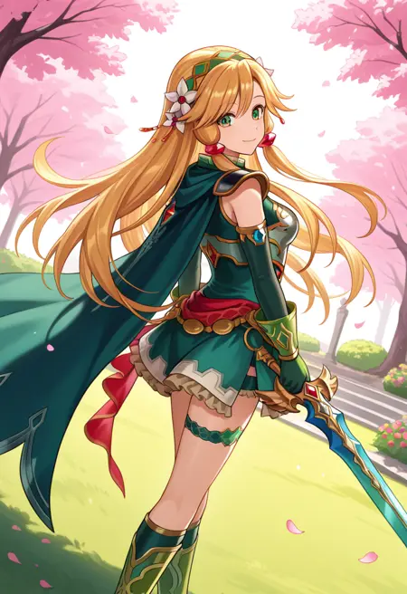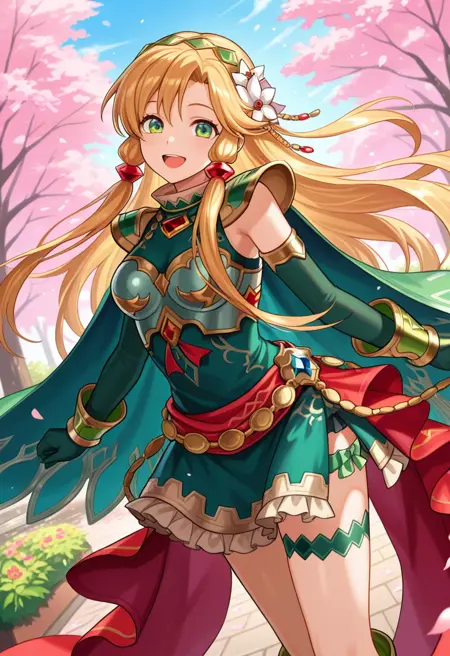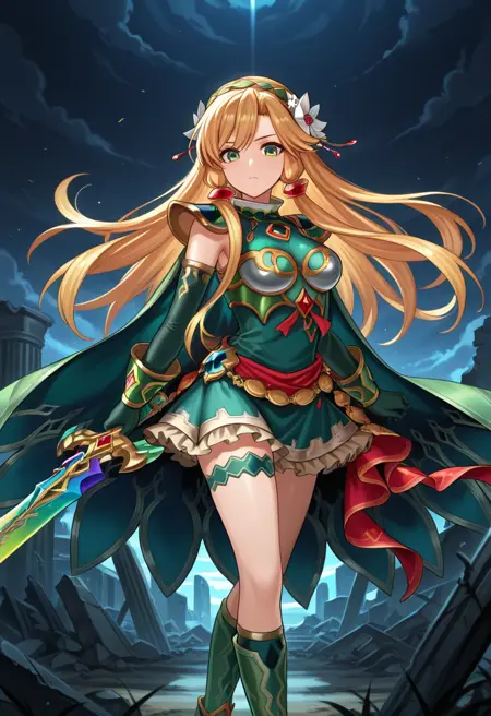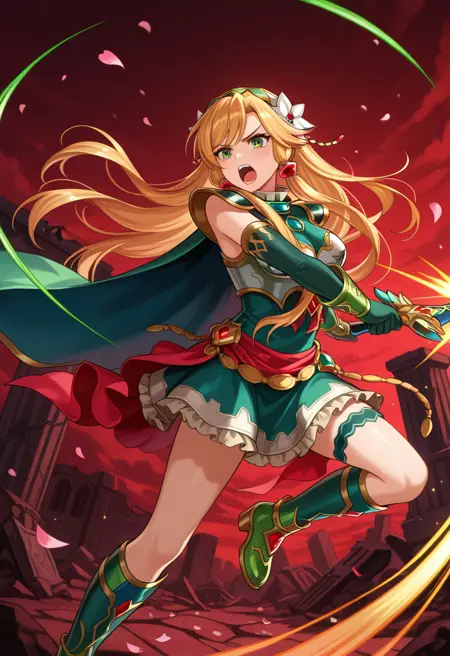 libera_(brave_frontier), 1girl, solo, 長い髪, 金色の髪, 流れる前髪, 髪飾り, 緑の目, 髪に花, 花, フリル, 髪バンド, ブーツ, 緑の手袋, 肘まである手袋, ブレスレット, 金色のベルト, アーマー, 太ももストラップ, 短いドレス, 緑のドレス, 胸当て, 肩アーマー, 緑のマント, オーバースカート,