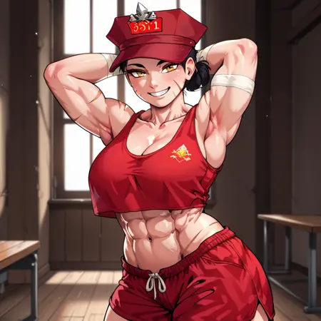 SL_Maeng_Bina, 1girl, solo, muscular female, veins, yellow eyes, scar on face, single hair bun, black hair, hat, red headwear, red tank top, shorts, red shorts, navel, bandages, scar, barefoot