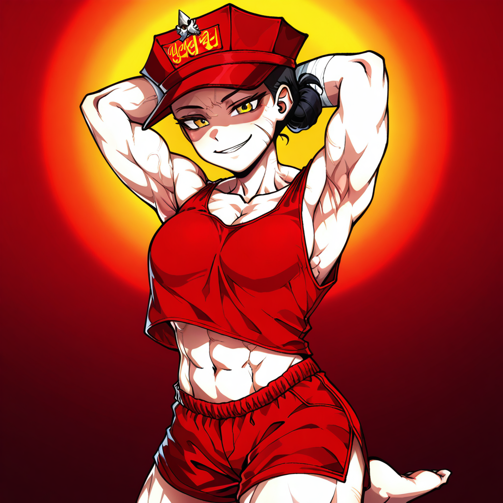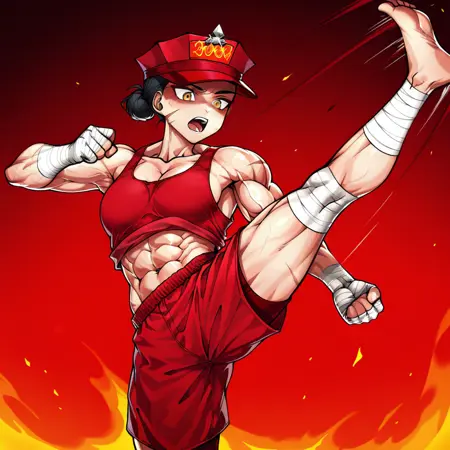 SL_Maeng_Bina, 1girl, solo, muscular female, veins, yellow eyes, scar on face, single hair bun, black hair, hat, red headwear, red tank top, shorts, red shorts, navel, bandages, scar, barefoot