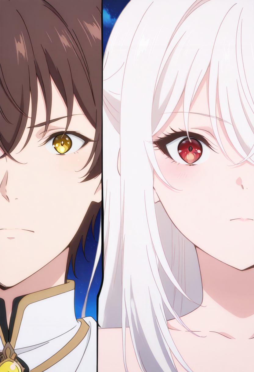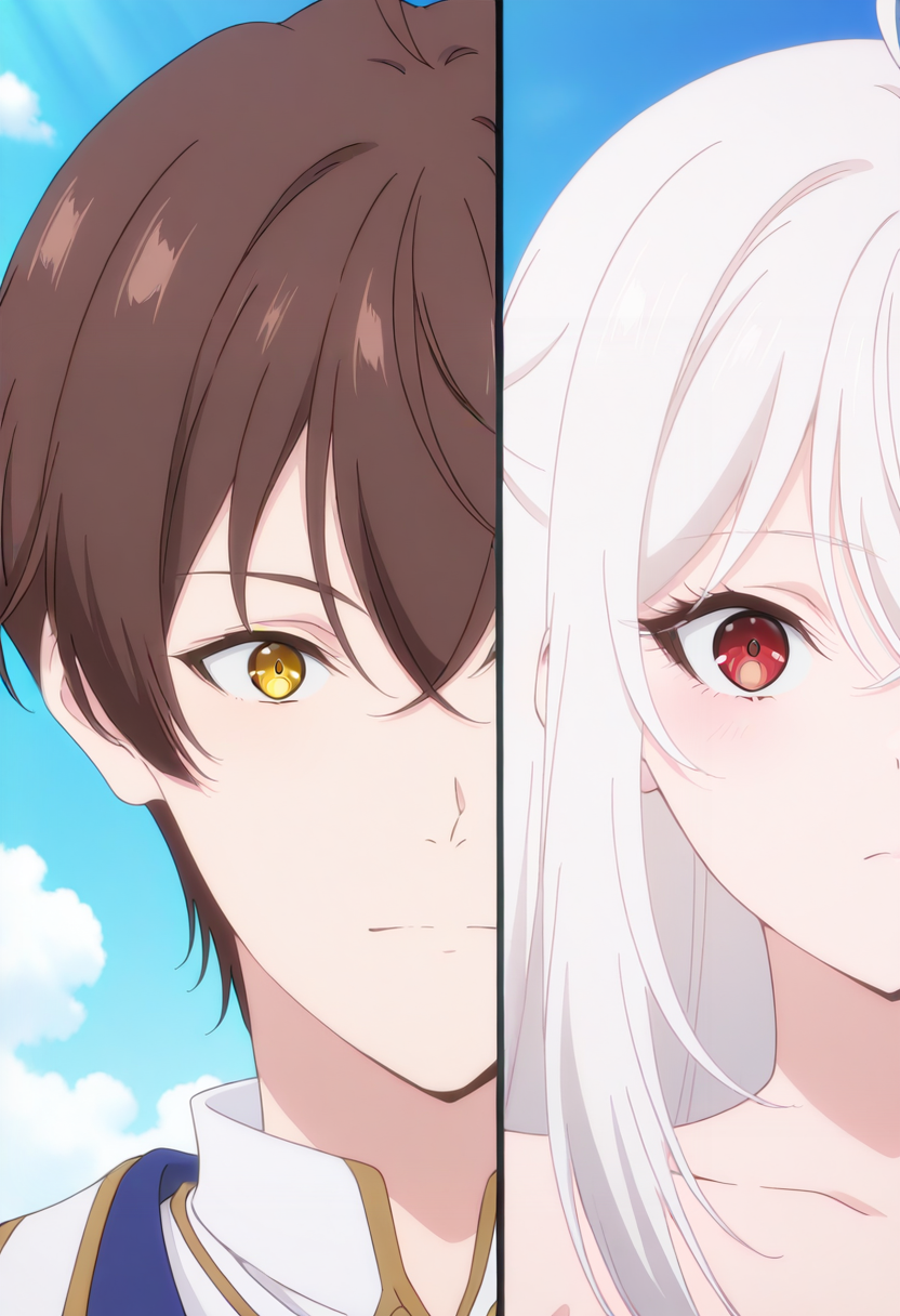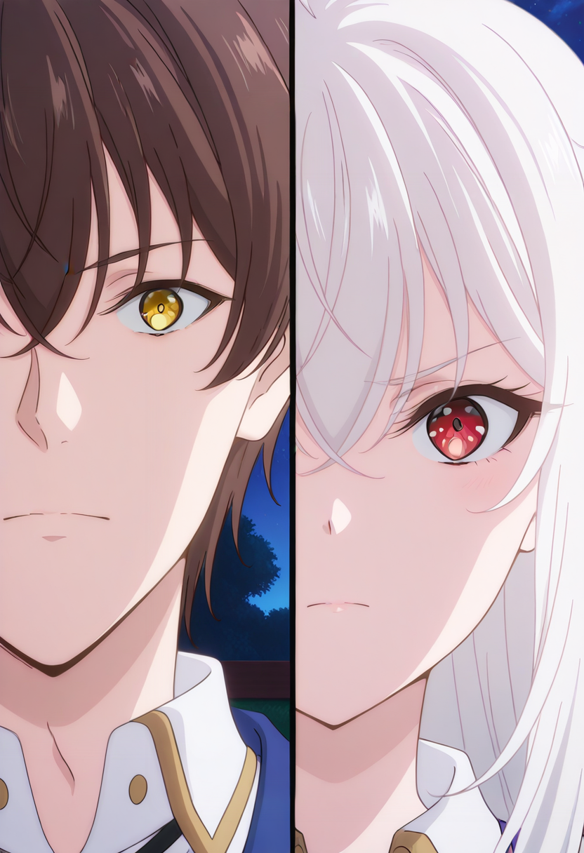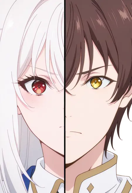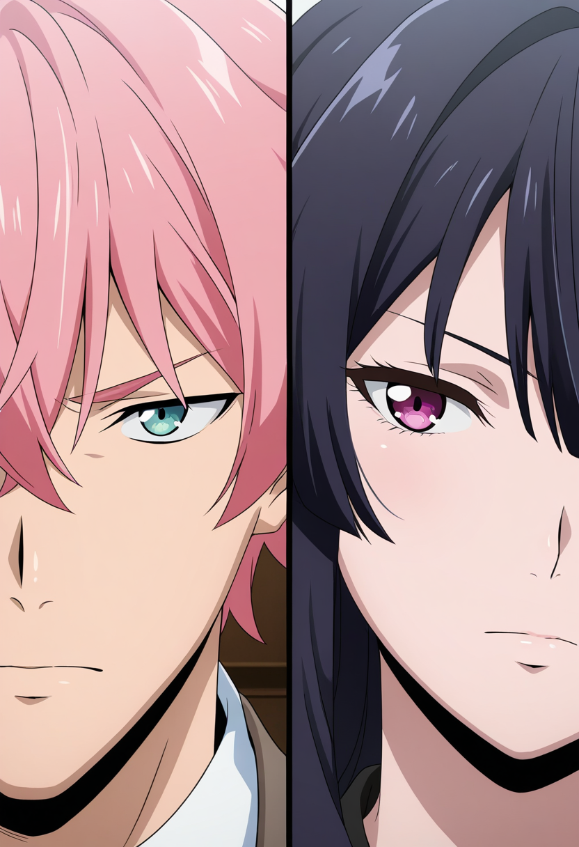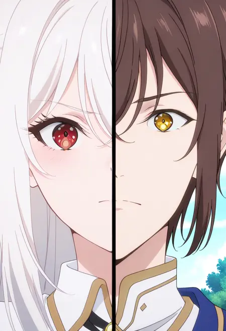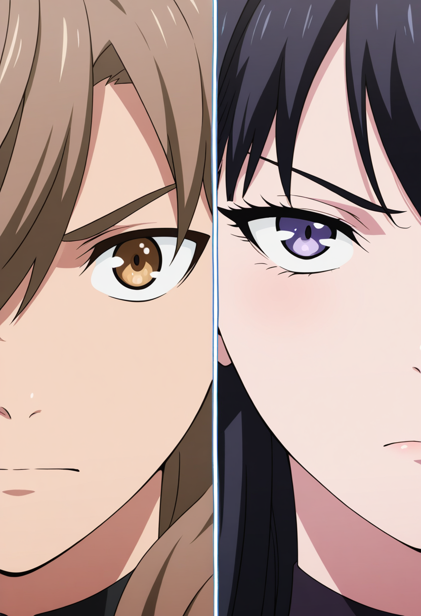 Splitduo-v1, 1boy, 1girl, split, Duo portrait, divided frame, two characters, split screen, facing the viewer, duo portrait