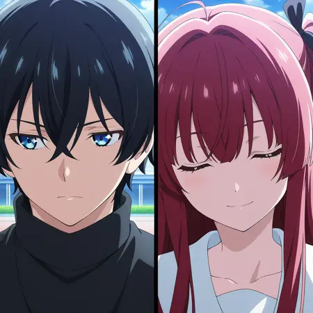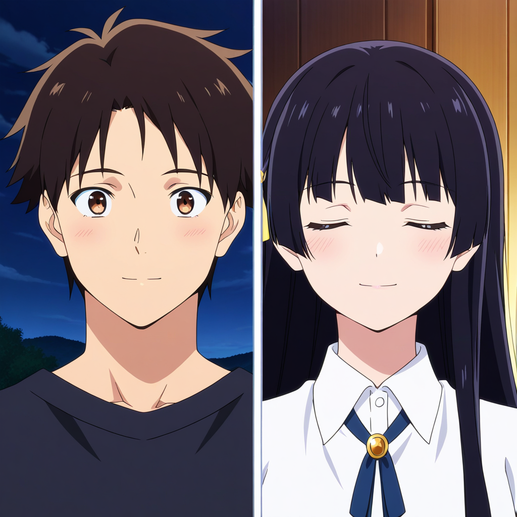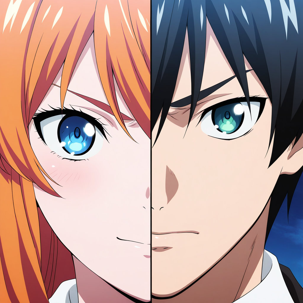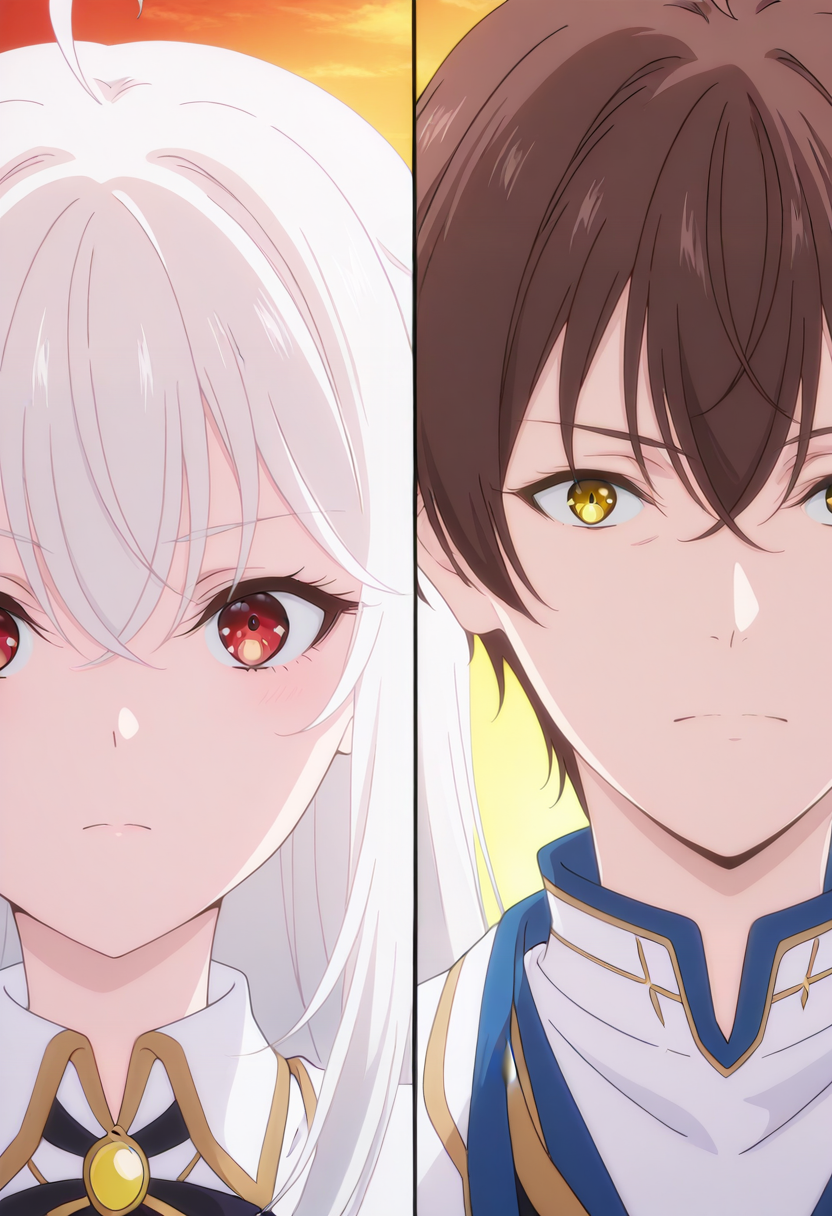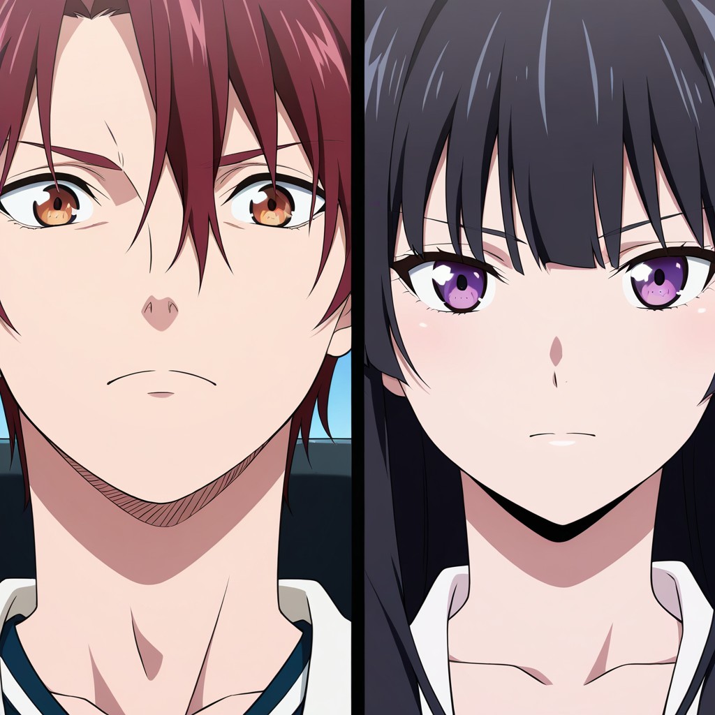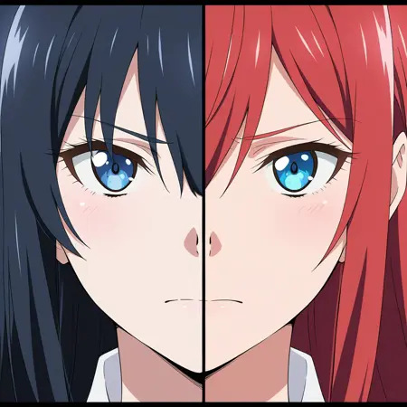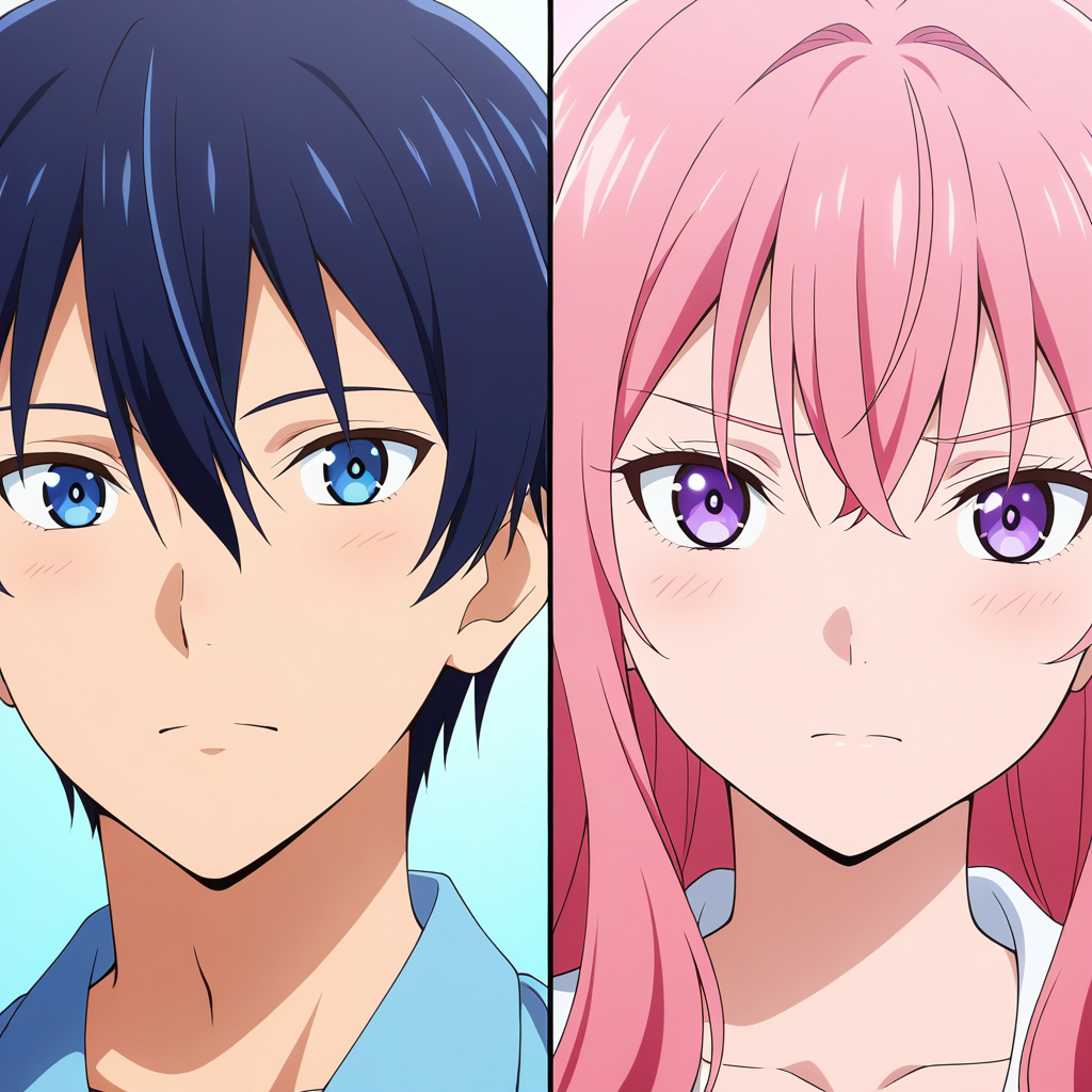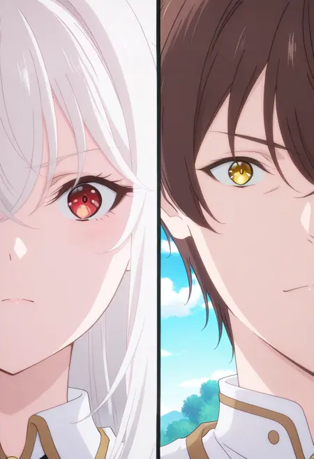 Splitduo-v1, 1boy, 1girl, split, Duo portrait, divided frame, two characters, split screen, facing the viewer, duo portrait
