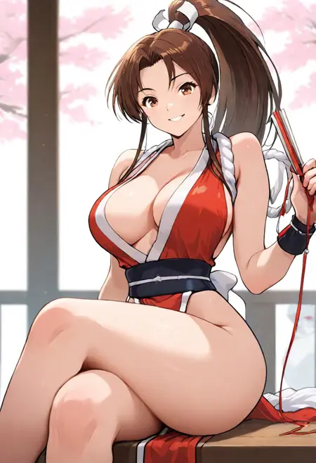 프롬프트 예시:masterpiece, best quality, amazing quality, maishau, maistandaroutfit, maihair, ponytail, 1girl, breasts, brown hair, cleavage, brown eyes, large breasts, solo, pelvic curtain, long hair, smile, ninja, thighs, looking at viewer, sash, Mai japanese clothes, high detail, depth of field