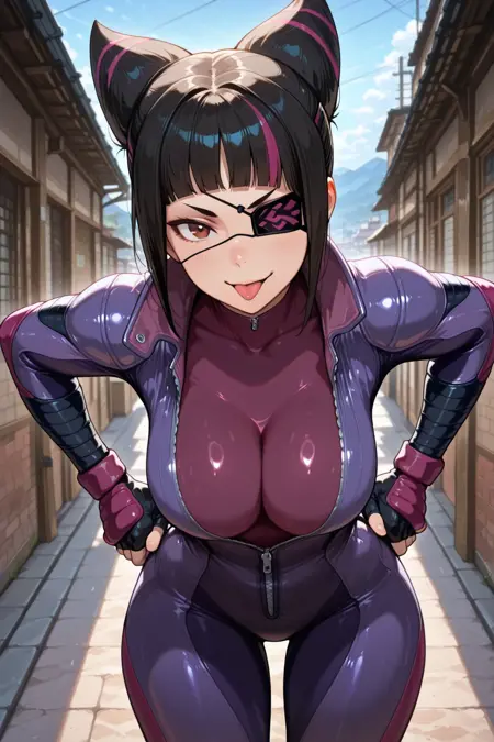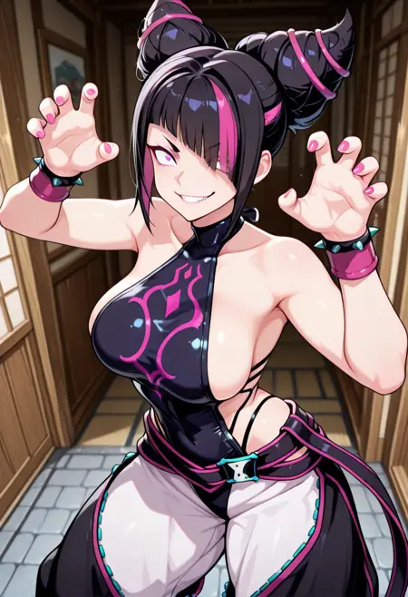 프롬프트 예시:masterpiece, best quality, amazing quality, jurifighter, juristandoutfit, juri_hairhorns, 1girl, multicolored hair, black hair, spiked collar, spiked bracelet, juri_fingerless gloves, Juri_pants, cleavage, solo, purple eyes, tongue out, looking at viewer, high detail, depth of field