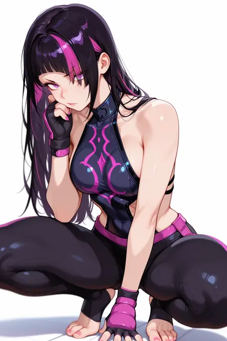 프롬프트 예시:masterpiece, best quality, amazing quality, jurifighter, juricasual, juri long hair, solo, black hair, long hair, feet, squatting, purple eyes, halterneck, bangs, nail polish, high detail, depth of field