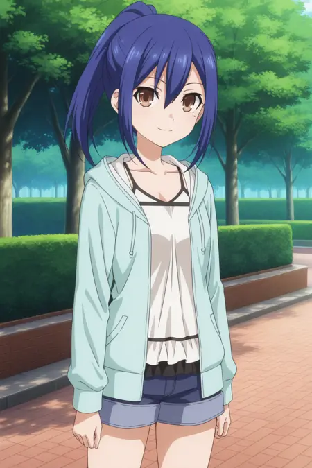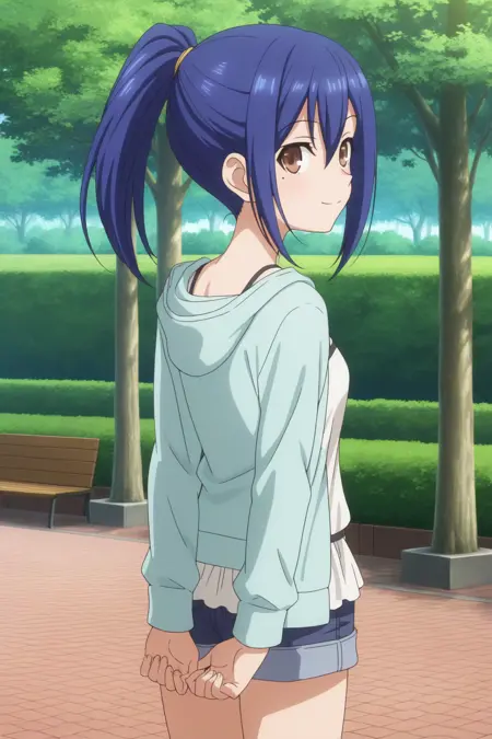 aamana, brown eyes, mole under eye, blue hair, ponytail, manac1, blue hoodie, open hoodie, white camisole, denim shorts, anime coloring,