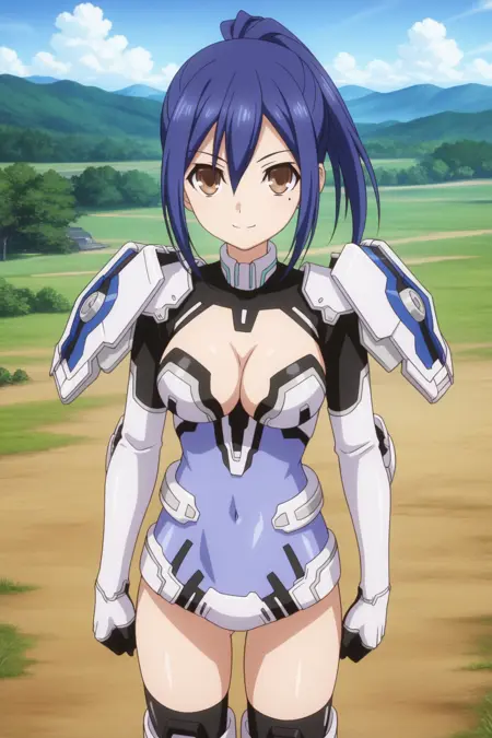 aamana, brown eyes, mole under eye, blue hair, ponytail, manaast, blue leotard, turtleneck, covered navel, cleavage cutout, pauldrons, elbow gloves, black thighhighs, knee boots, armored boots, anime coloring,