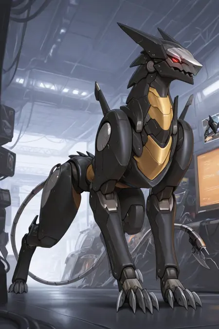 🔹 Core TraitsBladeWolf, robot, furry, red eyes, robotic joints, armor, mechanical tail, claws, metallic body