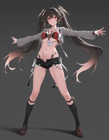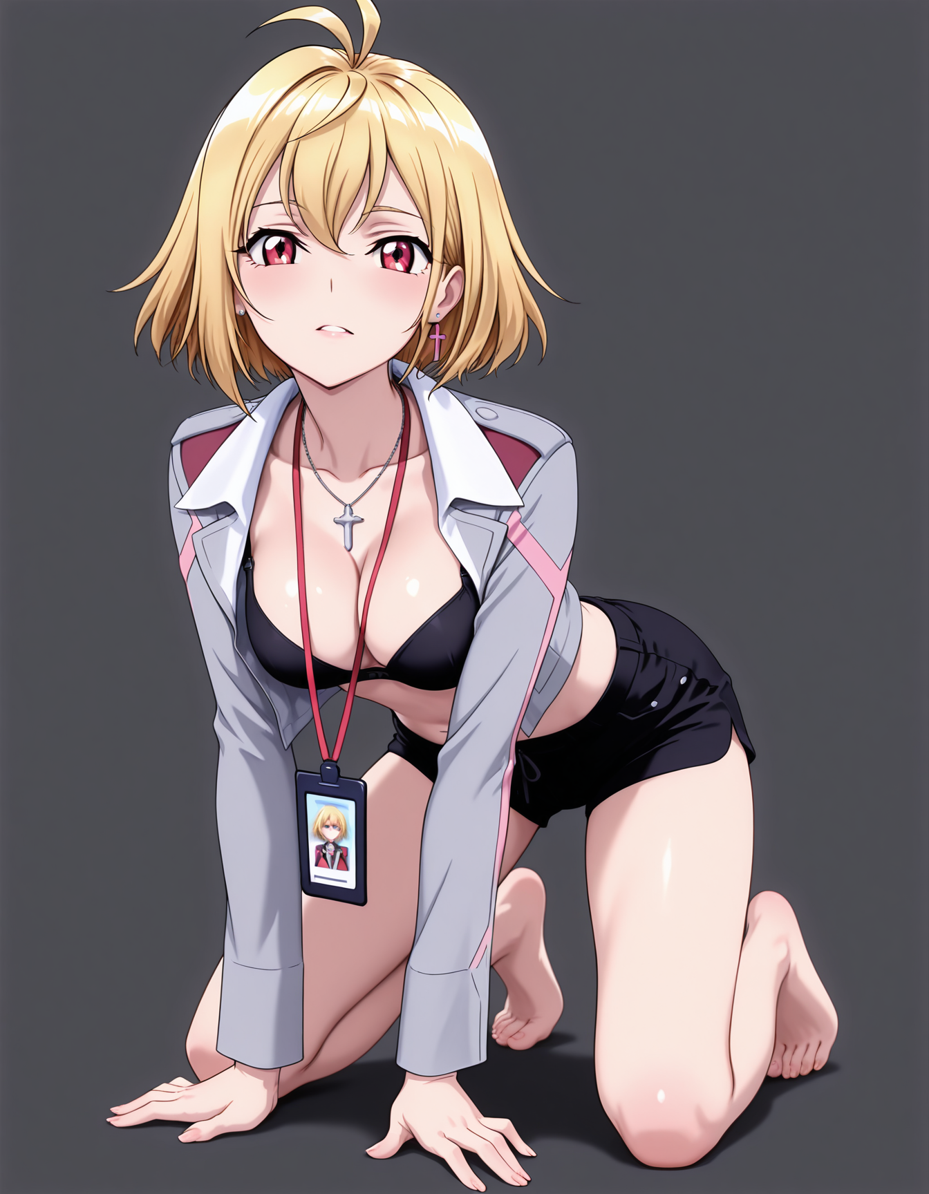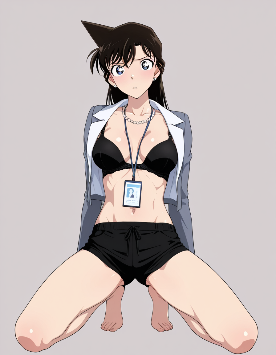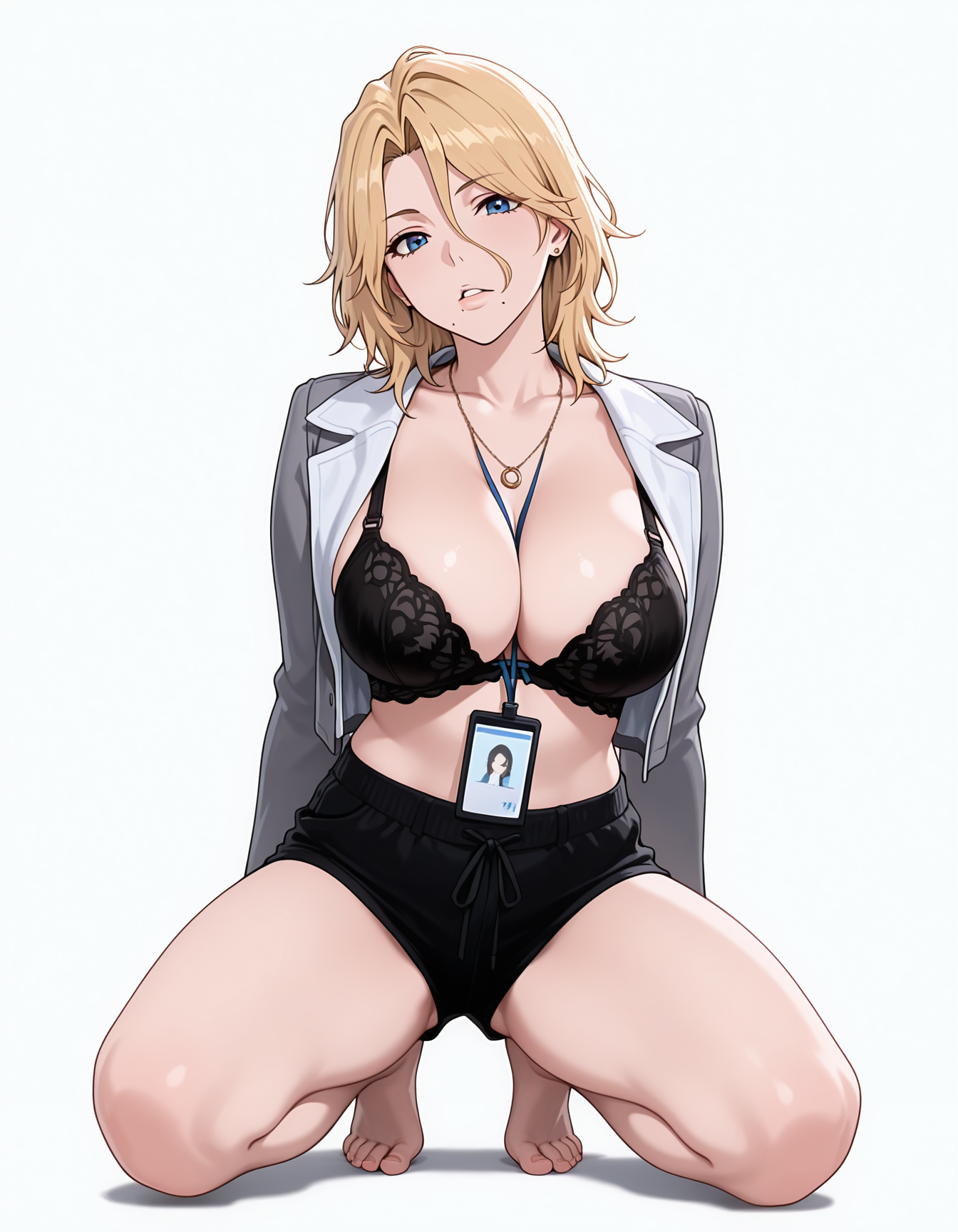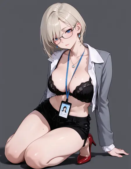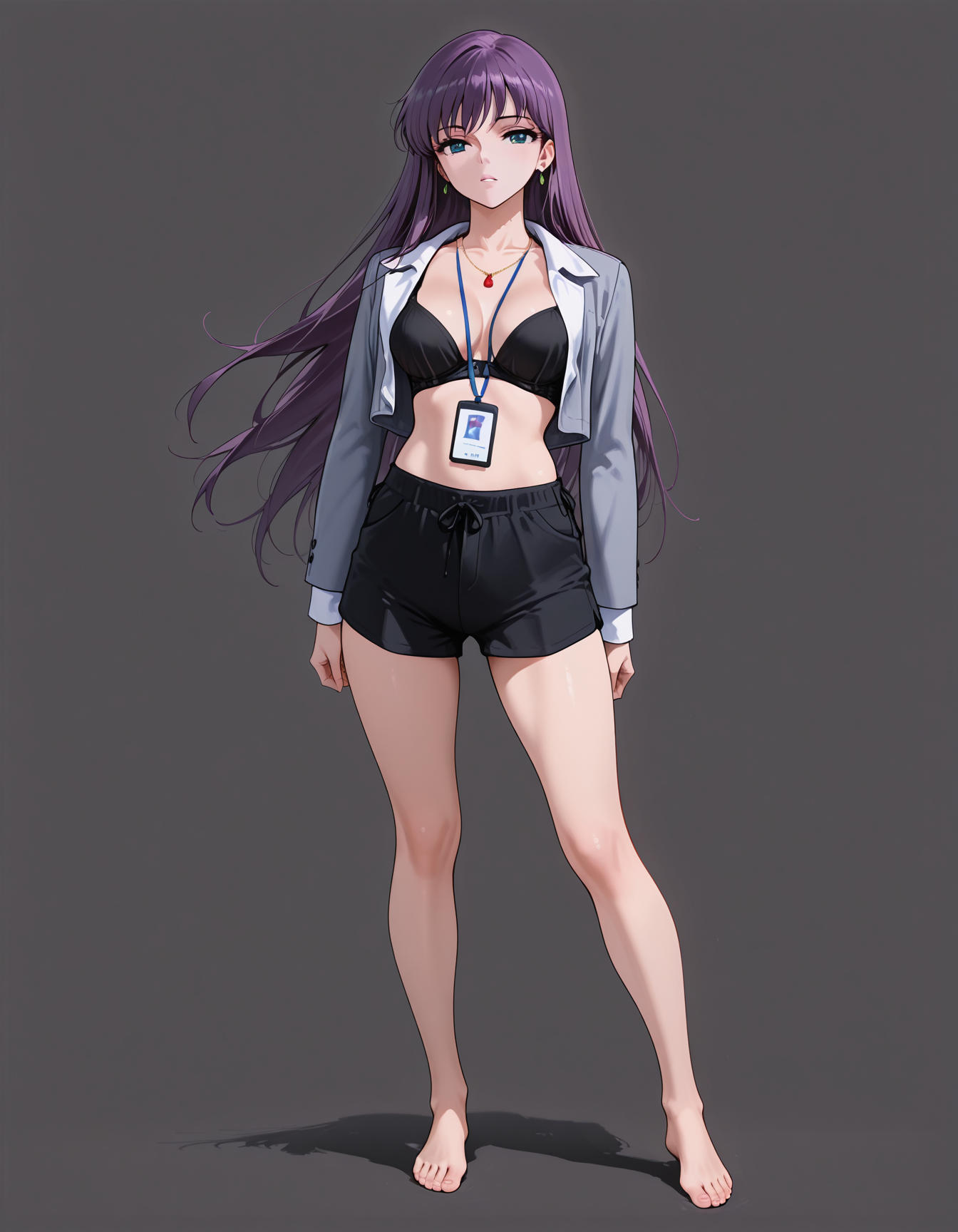 mai_bj_clothing_3,gray jacket,white shirt,open clothes,necklace,black_bra,lanyard,id_card,black shorts,necklace,earrings