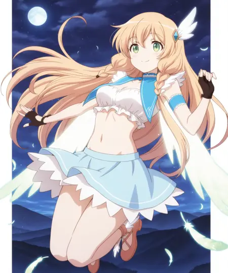 hair ornament, blue collar, white innerwear, wings, arm strap, fingerless gloves, midriff, navel, light blue skirt, feathered shoes,