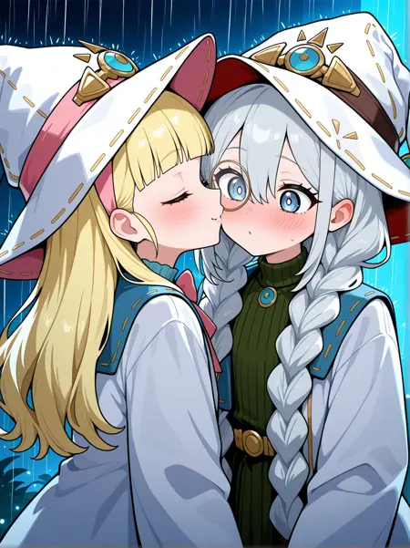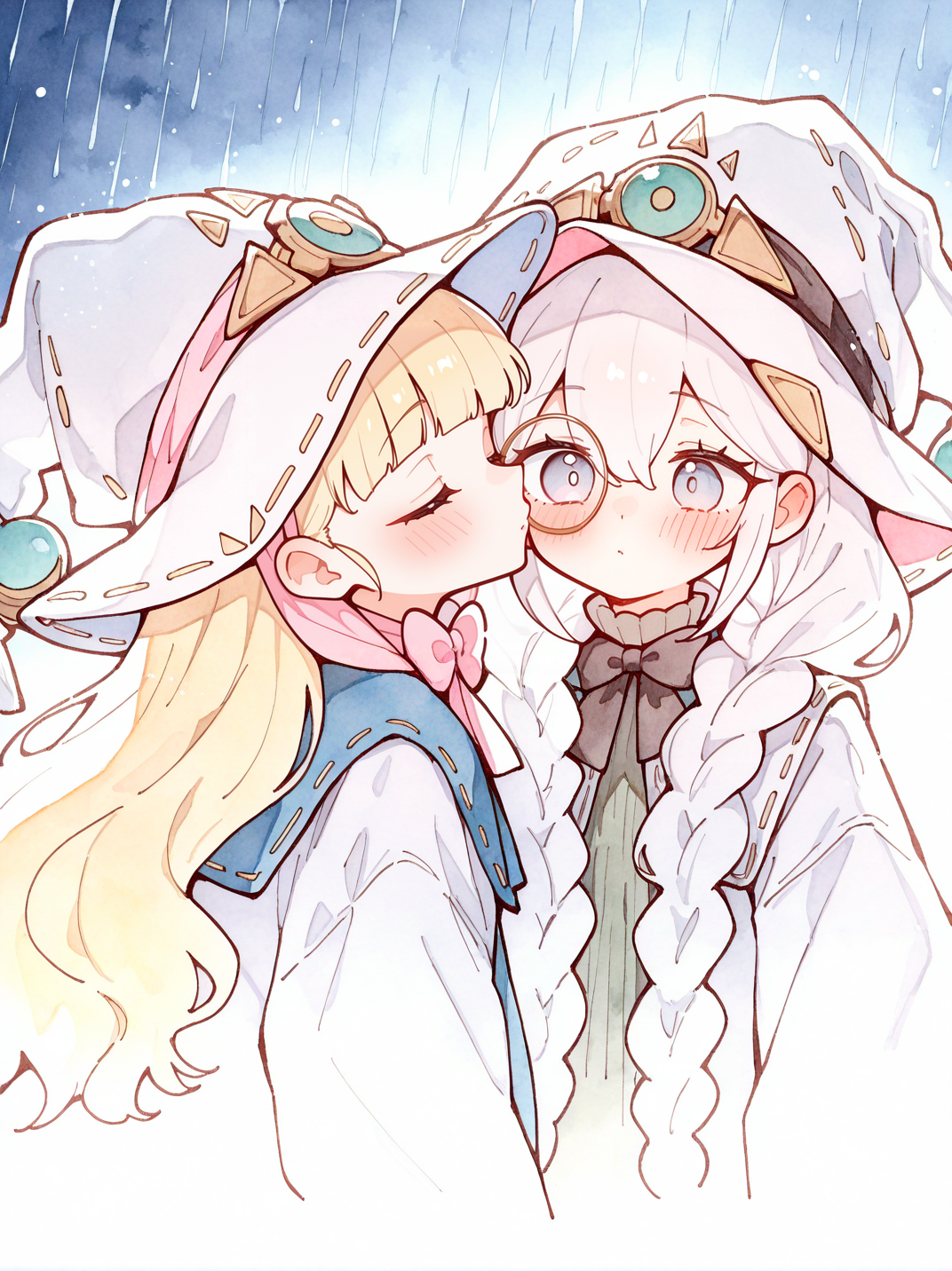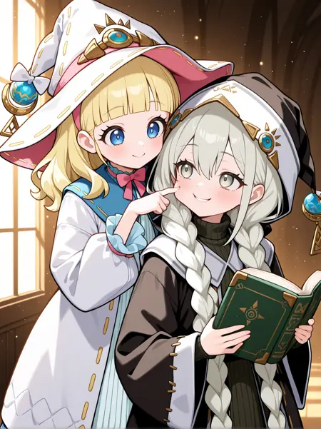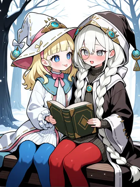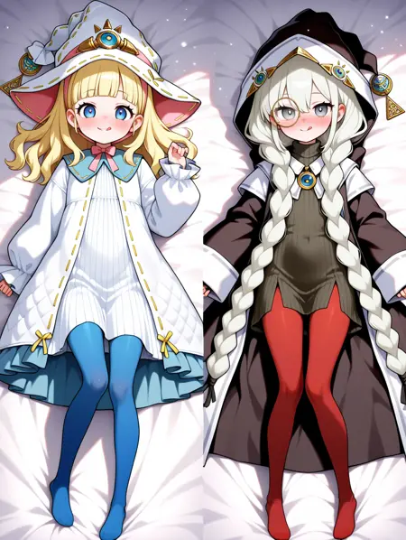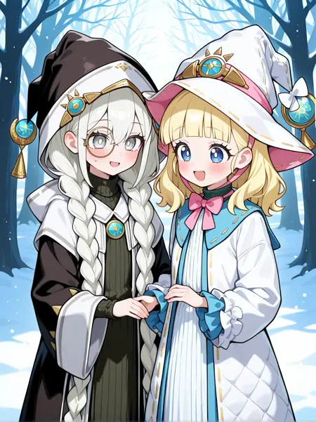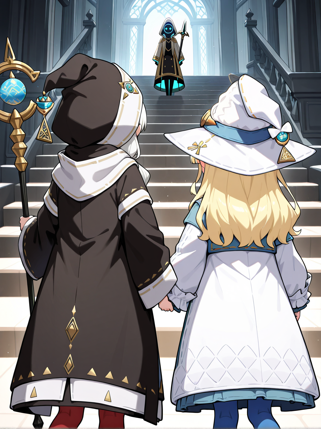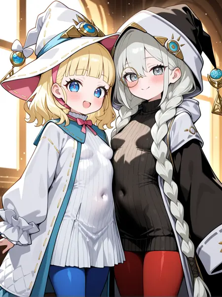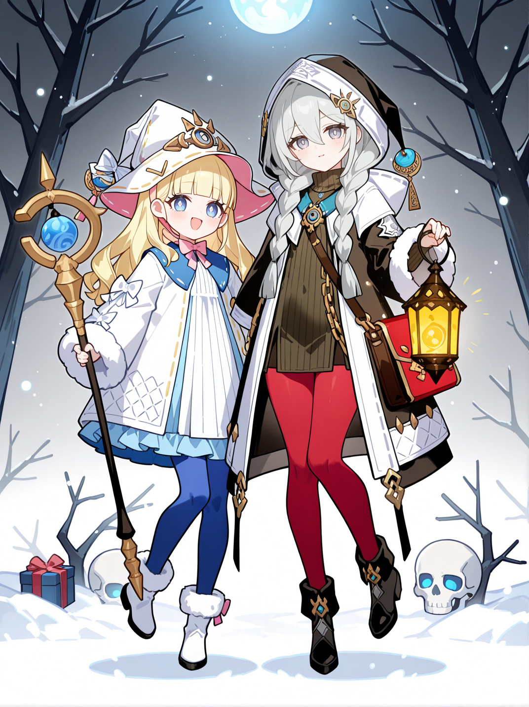 标签(服装-2):白色外套,白色连衣裙,蓝色连裤袜,白色女巫帽,白色长靴