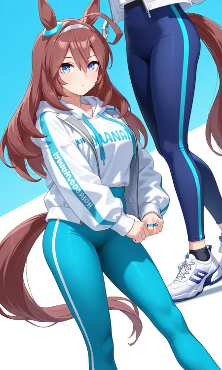 미호노 부르본 \(우마메무\) 긴 머리, 아호게, 파란 눈, 말 귀, 말 꼬리, 머리 장식, 귀 파란 링, 흰색 머리끈 캐주얼, 회색 머리끈, 흰색 후디, 옷에 글자, 긴 소매, 흰색 재킷, 열린 옷, 열린 재킷, 요가 바지, 파란 바지, 레깅스, 검은 양말, 신발, 흰색 신발