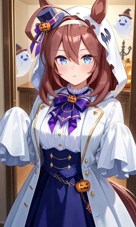 미호노 부르본 \(우마메무\) 긴 머리, 아호게, 파란 눈, 말 귀, 말 꼬리, 머리 장식, 귀 파란 링, 흰색 머리끈 공식 대체 복장, 유령 복장, 할로윈, 미니 탑햇, 검은색 머리장식, 머리 위에 재스민 호박, 보라색 리본, 후드 두른 상태, 흰색 셔츠, 긴 소매, 흰색 재킷, 체인