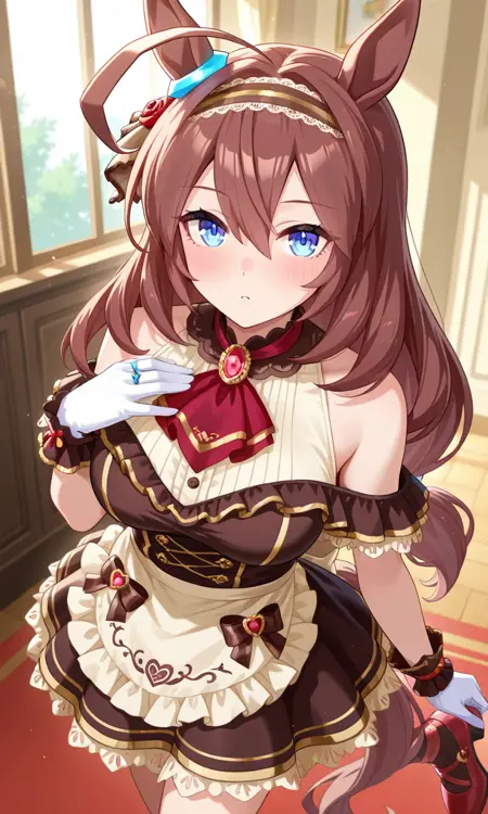 미호노 부르본 \(우마메무\) 긴 머리, 아호게, 파란 눈, 말 귀, 말 꼬리, 머리 장식, 귀 파란 링, 흰색 머리끈 공식 대체 복장, 발렌타인, 흰장갑, 낮게 묶인 긴 머리, 갈색 머리끈, 프릴이 있는 머리끈, 머리 장식, 보석, 브로치, 어깨 절개, 드러난 어깨, 빨간 애스콧, 어깨 노출 드레스, 소매 없는 드레스, 손목 커프스, 갈색 드레스, 프릴, 허리 앞치마, 빨간 신발