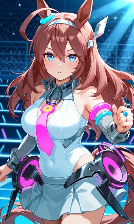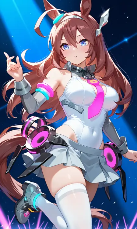 미호노 부르본 \(우마메무\) 긴 머리, 아호게, 파란 눈, 말 귀, 말 꼬리, 머리 장식, 귀 파란 링, 흰색 머리끈, 회색 머리끈, 빛나는 머리 장식, 분리된 소매, 드러난 어깨, 옷 자르기, 분홍색 넥타이, 흰색 레오타드, 하이레그 레오타드, 주름 치마, 회색 치마, 로우레그 치마, 미니 스커트, 흰색 허벅지 스타킹, 회색 신발