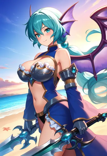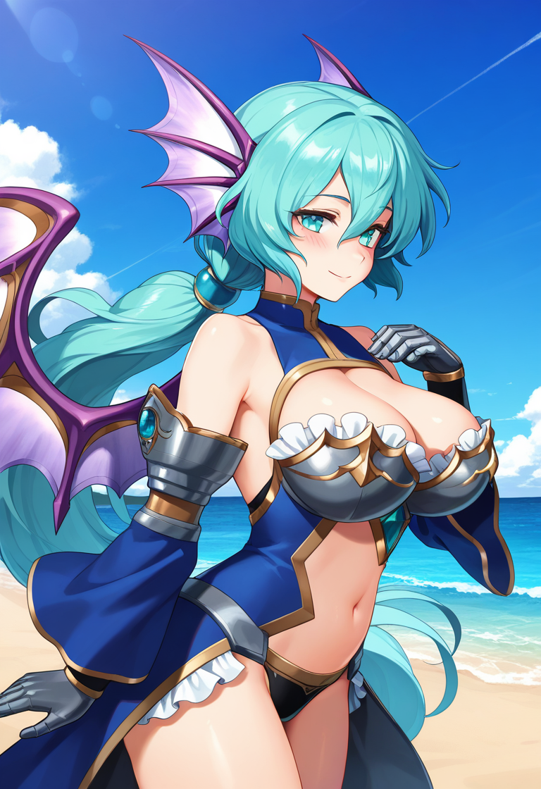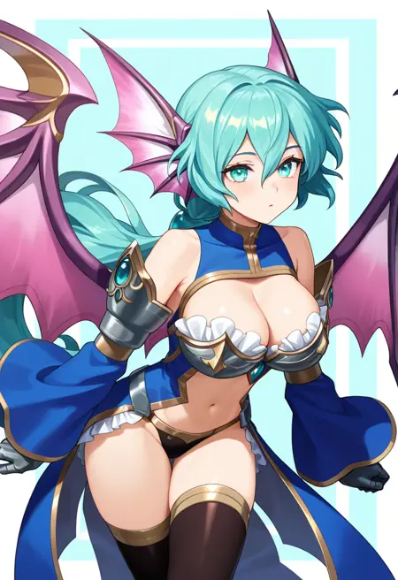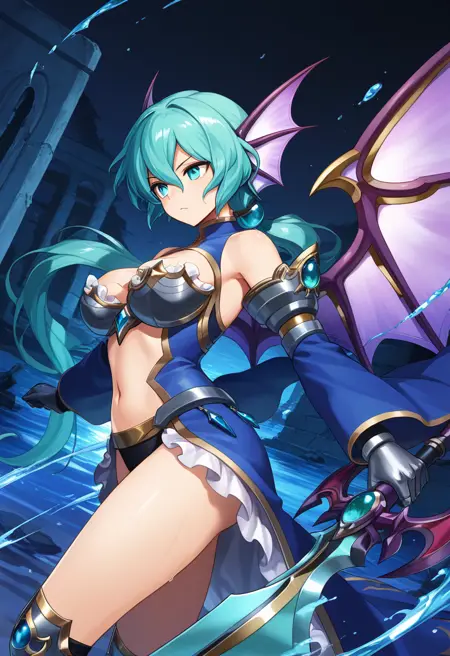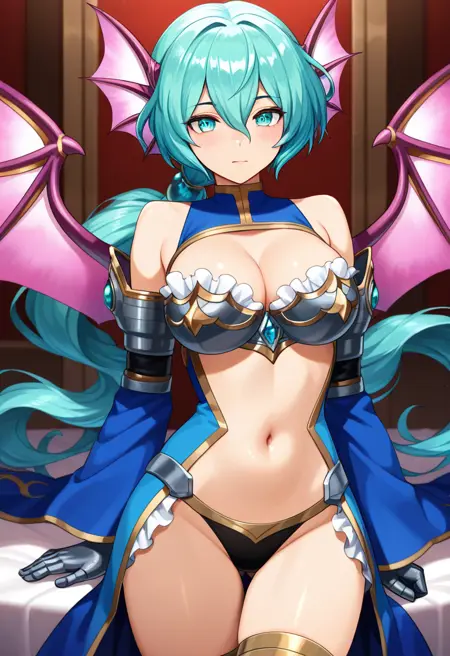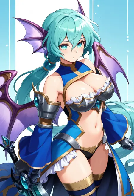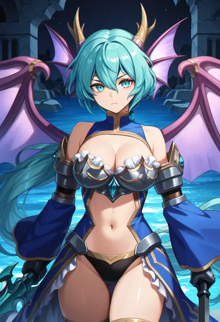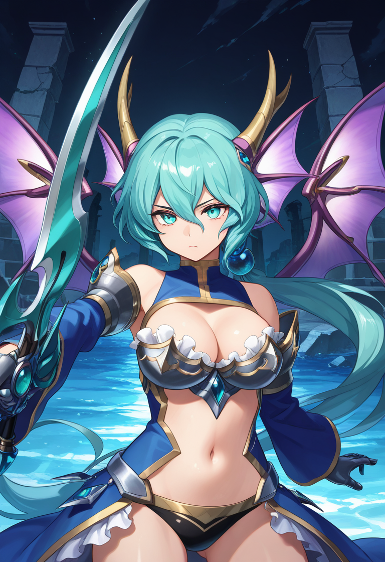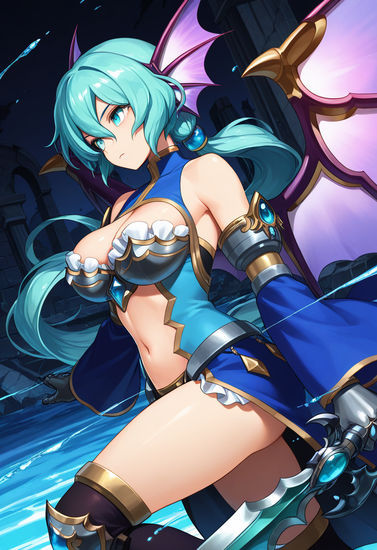 lucina_(brave_frontier), 1girl. 单人,长发,极长发, Aqua色头发,低马尾,头发遮住眼睛,Aqua色眼睛,卷发,头部鳍状物,紫色头部鳍状物,角,肚脐,乳沟,裸露肩膀,褶边,翅膀,紫色翅膀,分体袖子,宽袖,蓝色袖子,露腹,比基尼盔甲,护腕,蓝色长裙,黑色过膝长袜,高跟靴,盔甲靴