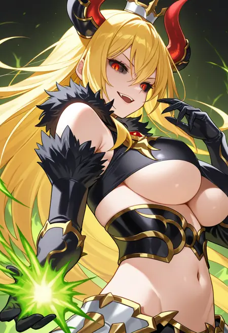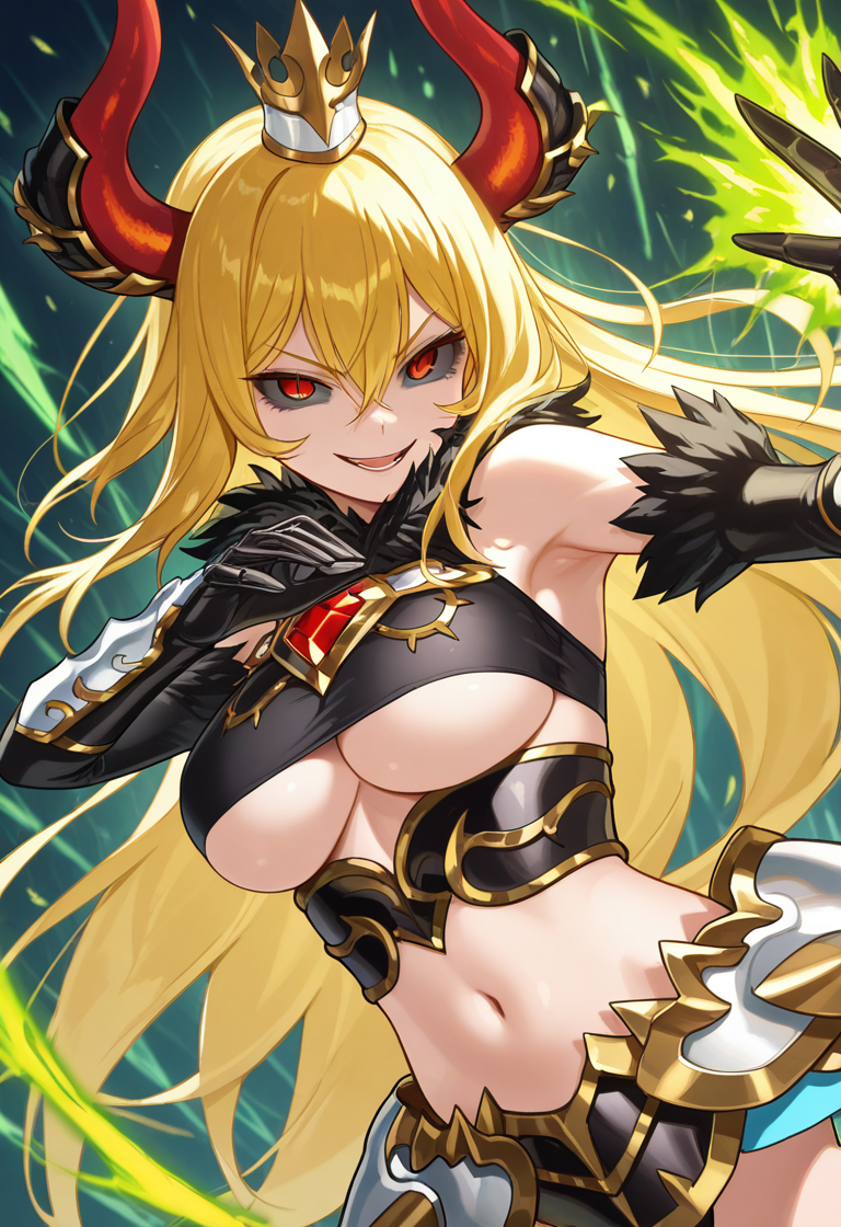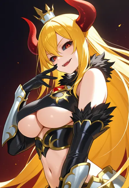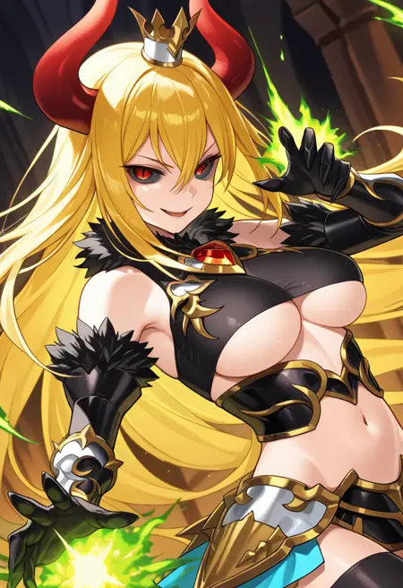 zellha_(brave_frontier), 1girl. シングル、金髪、長い髪、赤い角、悪魔の角、王冠、額に髪がかかる、色のついた虹彩、縦に細い瞳孔、へそ、毛皮のフリル、アンダーブスト、裸の肩、ブライダルグローブ、アーマー、黒いアーマー、黒いハイソックス、ハイヒールブーツ、アーマードブーツ